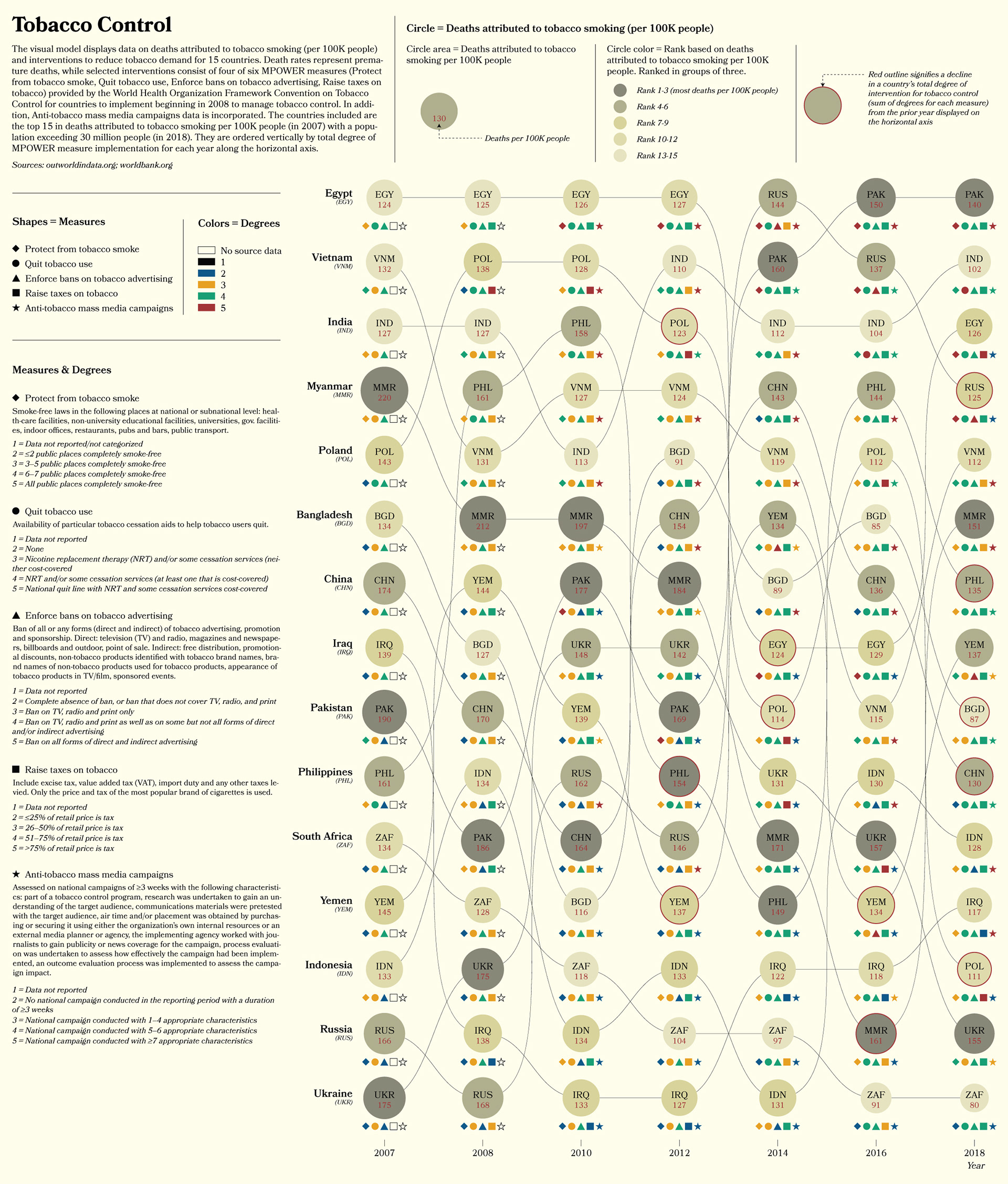 Tobacco smoke is one of the top global causes of premature death. This includes both tobacco smokers themselves as well as individuals who experience second-hand smoke. In 2008, to help countries manage tobacco control domestically, the World Health Organization Framework Convention on Tobacco Control provided foundational MPOWER measures (Monitor tobacco use, Protect from tobacco smoke, Quit tobacco use, Warning about the dangers of tobacco, Enforce bans on tobacco advertising, Raise taxes on tobacco) that could be implemented with the intention of reducing tobacco demand. Interested in the actual impact these measures had on tobacco demand, I created a visual model displaying data on deaths attributed to tobacco smoking (per 100K people) and four of the six aforementioned intervention measures to reduce tobacco demand for 15 countries. The countries included are the top 15 in deaths attributed to tobacco smoking per 100K people (in 2007) with a population exceeding 30 million people (in 2018). Anti-tobacco mass media campaigns data is incorporated as well, which is separate from the "Warning about the dangers of tobacco" measure, referring to warnings on tobacco product packaging.